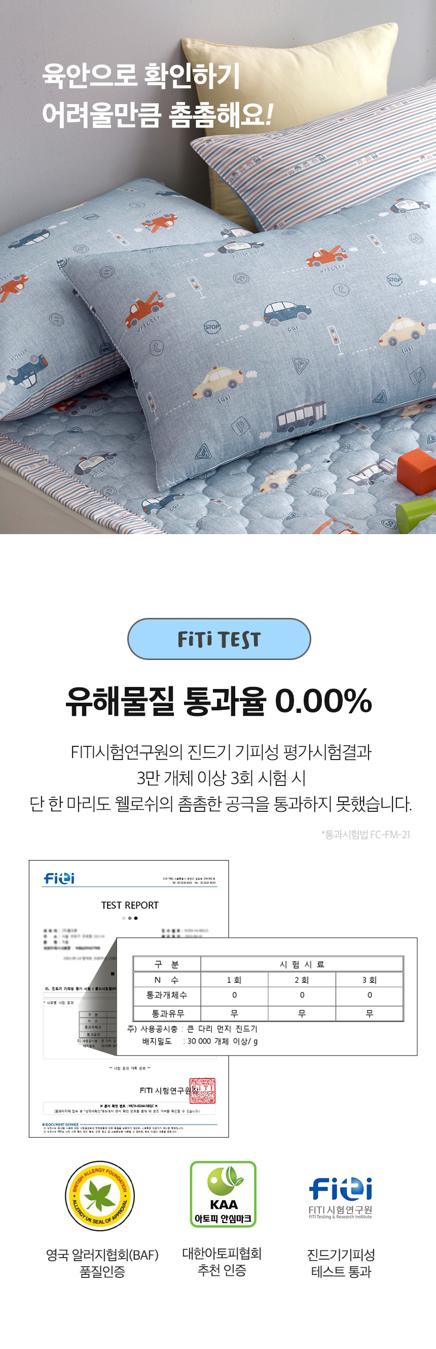 • 유해물질 통과율 0.00% , 진드기기피성 테스트 통과