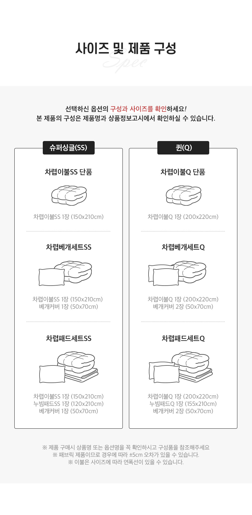 차렵이불 SS: 150X210cm, 차렵이불 Q: 200X230cm