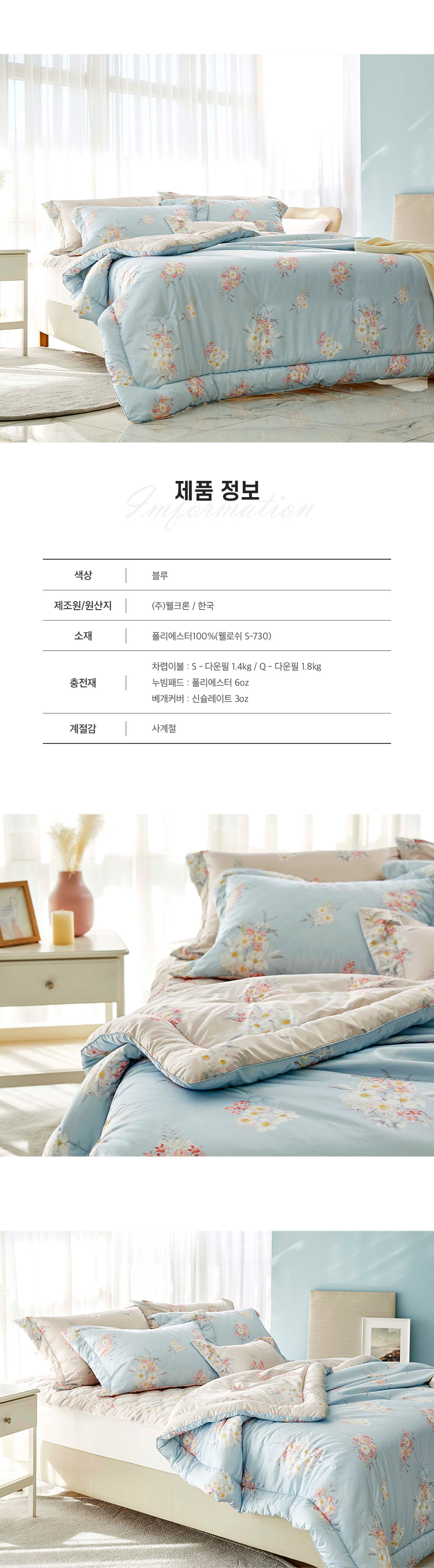 차렵이불 : 160X210cm, 200X230cm / 누빔패드 : 120X210cm, 155X210cm, 180X210cm / 베개커버 : 50X70cm
