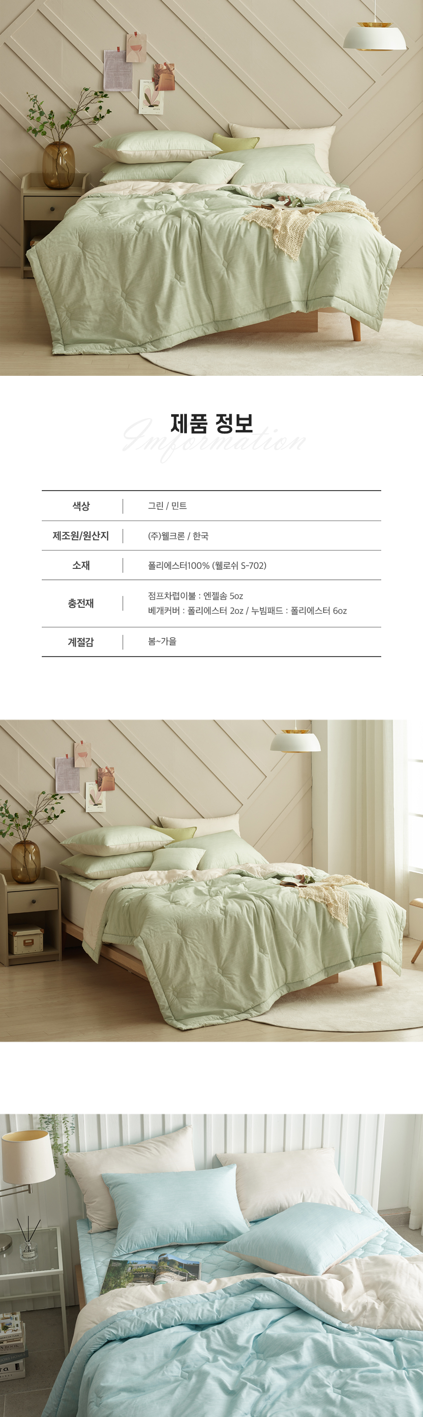 차렵이불 : 160X210cm, 200X230cm / 누빔패드 : 120X210cm, 155X210cm, 180X210cm / 베개커버 : 50X70cm